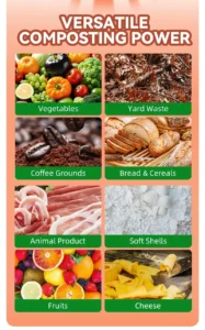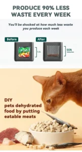 - 90% of food waste like fruits, vegetables, eggshells, breads, leftover meat scraps and even pet foods, chicken bones can be dehydrated and grinded.