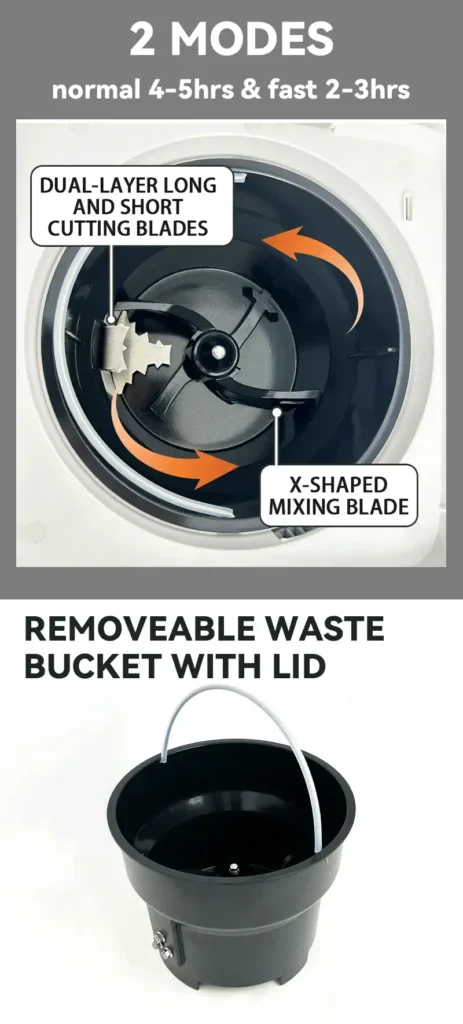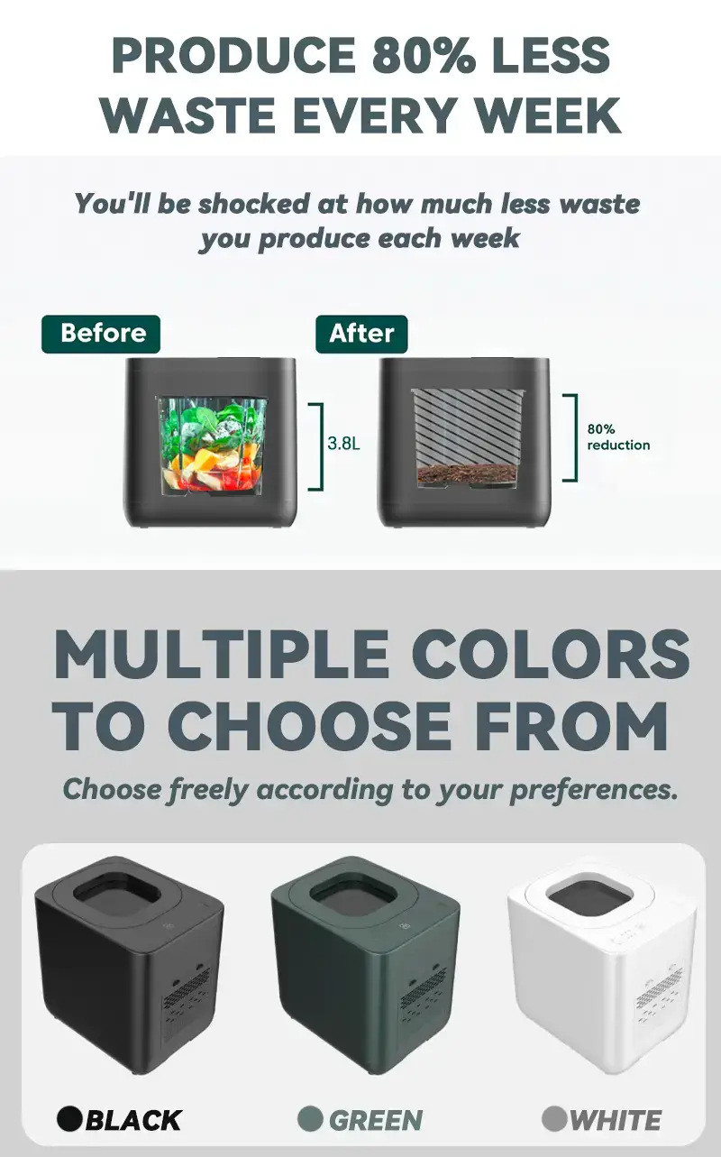 Odorless & Quiet: eliminates food scrap odors by carbon filter lid for indoor use