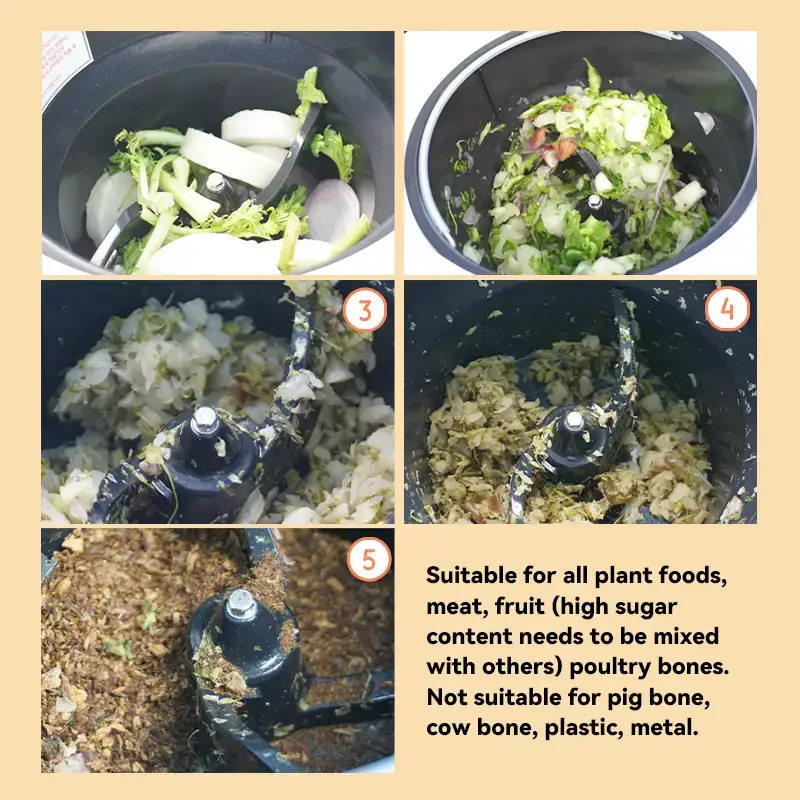 90% of food waste like fruits, vegetables, eggshells, breads, leftover meat scraps and even pet foods, chicken bones can be dehydrated and grinded.